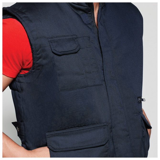muški; na zip; dodatno zatvaranje na čičak; duža leđa; 3 džepa na preklop, 1 džep na zip te 2 džepića za olovke s vanjske strane i 1 džep sa zatvaranjem na čičak s unutarnje strane; 2 remenčića za podešavanje širine leđa; 200 g/m2; sirovinski sastav: 85 % poliester, 15 % pamuk i unutrašnja strana 100 % poliester XL Pakiranje: 1/20