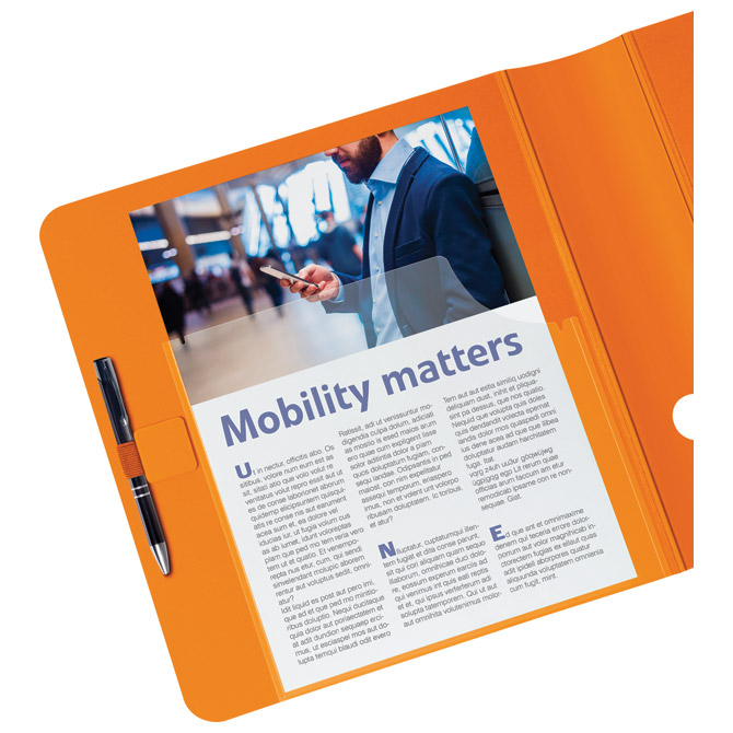 atraktivno zatvaranje s gumicom i rupa za prst na hrptu za jednostavno rukovanje i siguran transport dokumenata;