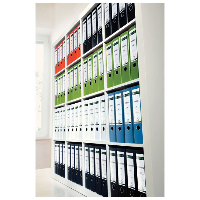format: A4; hrbat s džepom i etiketom; robusni karton presvučen PP folijom u boji s vanjske strane i plastificiranim bijelim papirom s unutarnje strane; metalna šina na donjim rubovima, bočno zatvaranje i rupa za prst na hrptu za jednostavno rukovanje i sigurno skladištenje dokumenata; patentirani mehanizam sa polugom koja se otvara za 180° i time omogućuje 50 % šire otvaranje, 20 % brži rad i istovremeno odlaganje na obadvije strane; 5 godina garanicije na mehanizam; FSC certifikat 80 mm / 285x318x81 mm / 600 listova 80 gramskog papira Pakiranje: 20/480