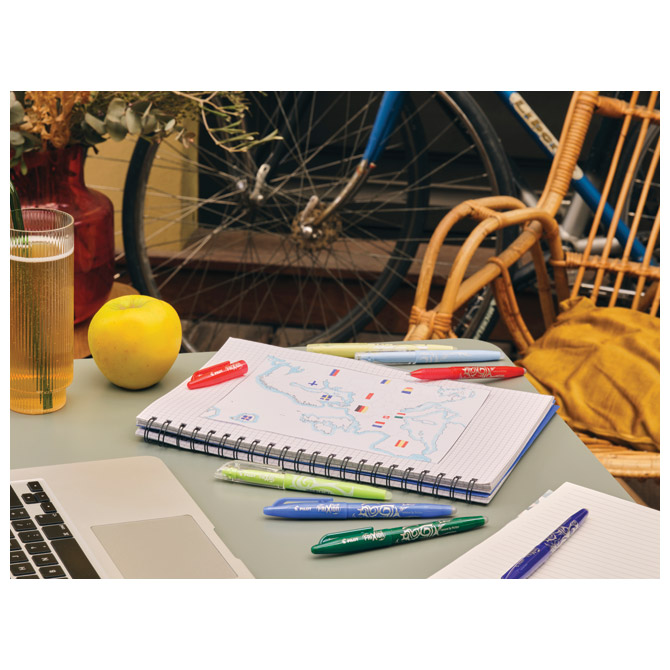 promjer kuglice: 0,7 mm; širina ispisa: 0,35 mm; ergonomski gumirani grip; plastično tijelo olovke; piši-briši-ponovi model; termo-osjetljiva tinta na bazi gela; s poklopcem; 50 % izrađeno iz recikliranih materijala (izuzev zamjenjivih dijelova); rezervni uložak BLS-FR7-S3; tinta na višim temperaturama postane transparentna ili se obriše sa gumicom na vrhu rolera; na niskim temperaturama (-10°C) tinta se ponovno pojavljuje nebesko plava Pakiranje: 12/144/864