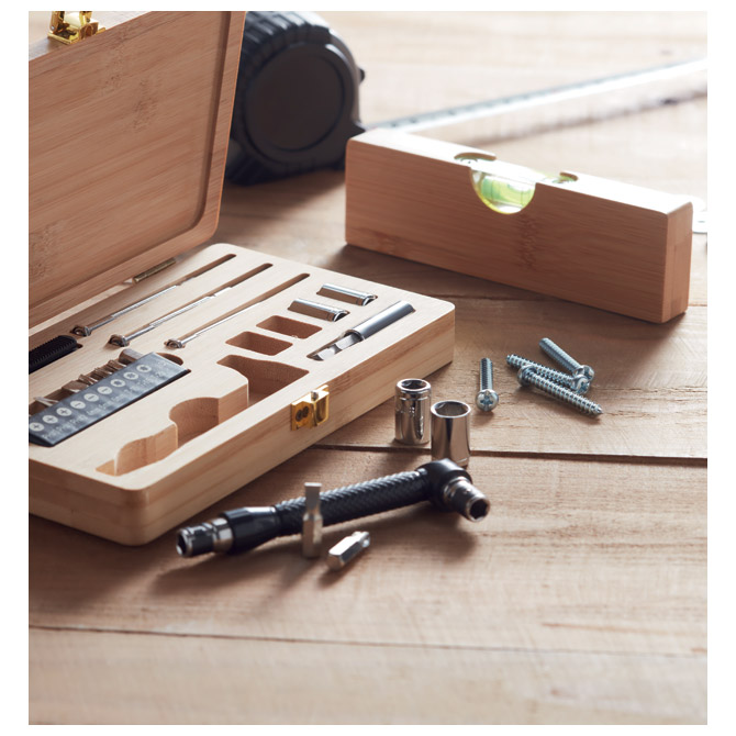 sadrži 21 dio: 3 odvijača, 10 bitova u držaču, 3 veličine s prorezima, 3 Torx veličine i 1 adapter, 4 ključa, 1 rezač, 1 ručku i 1 konektor; dimenzija: 19 ,5×11,8×3 cm; u kućištu od bambusa prirodnog izgleda Pakiranje: 1/20