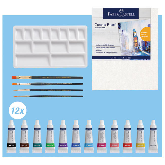 set od 12xakrilnih boja u Pvc tubi od 9 ml.; 4xsint.kista; 1xplatno 20×20; 1xpaleta Pakiranje: 1