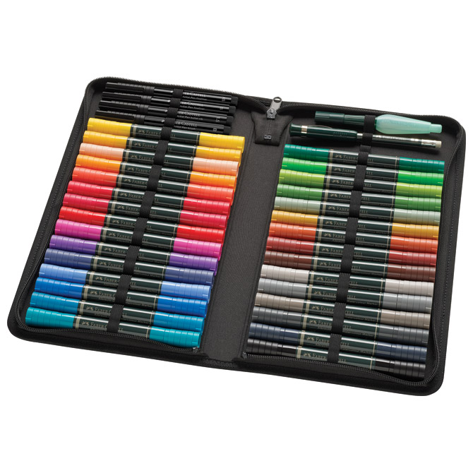 idealan za umjetnički rad i izražajno crtanje), 4 x flomaster Pitt Artist Pen (fineliner XS, fineliner S, bullet nib 1,5 mm i brushpen B), 1 x olovka grafitna Perfect Pencil Castell 9000 B i kist za vodene boje (sa spremnikom za vodu);