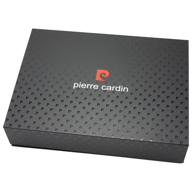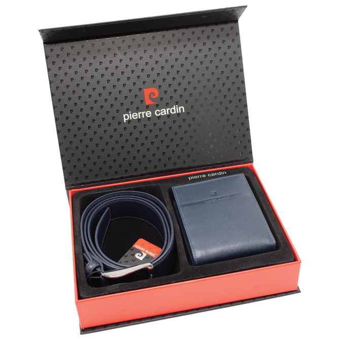 muški; kožni; u kartonskoj poklon kutiji sa zatvaranjem na magnet; sadrži: remen (širina: 3,4 cm; trn kopča; prošiveni) i novčanik (odjeljak za sitni novac; zatvaranje na preklop) 12,5×9,5 cm