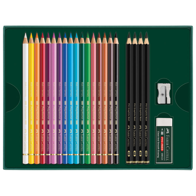 sadrži: 17 x boja drvenih Polychromos; 4 x Pitt graphite Matt; 1 x šiljilo; 1 x gumica Pakiranje: 1