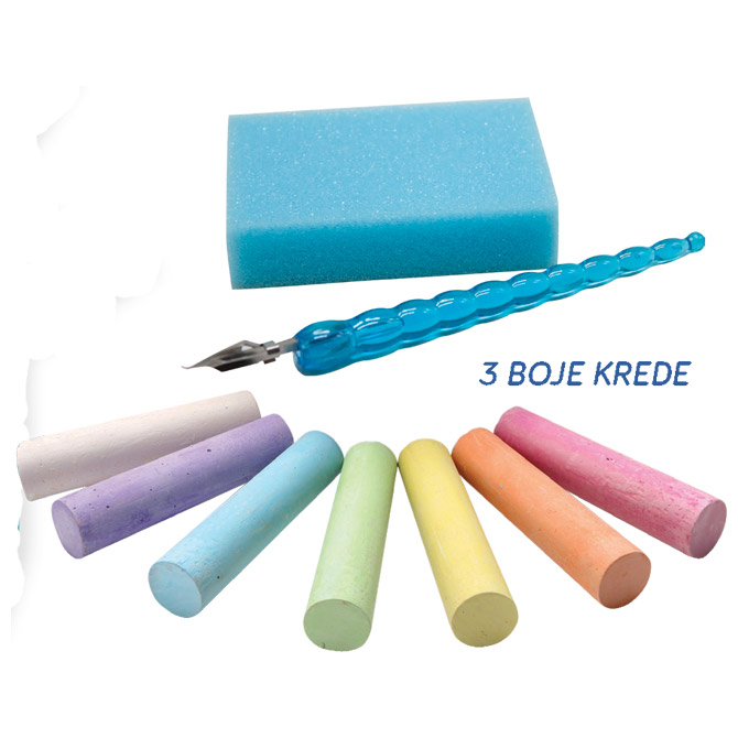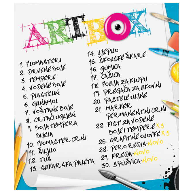 set sadrži: grafitne olovke, drvene boje, flomastere, voštane boje, vodene boje, tempere, paletu, kistove, glinamol, plastelin, ugljen, crni tuš, pero redis i držalo, spužvica, kreda ulična, škarice, ljepila, gumicu, čašicu, foliju za klupu, boju temperu bijelu, flomaster školski crni, pregaču za likovni, šiljilo, marker permanentni i pastele uljne;