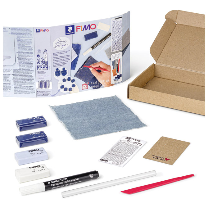 4 boje x 25 g (boje: windsor plava 2x+pacifik plava+bijela); stvrdnjava se u pećnici (30 minuta na 110°C); mekana i glatka; lako se oblikuje; efekt traperica; sadrži: uzorak tkanine; bijela akrilna boja 12 ml; štapić za modeliranje; korak-po-korak upute + FIMO upute; posebno namijenjen početnicima i ljubiteljima umjetnosti; svestran: za nakit, dodatke i dekorativni predmete za dom; blister Pakiranje: 1/5/50