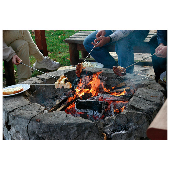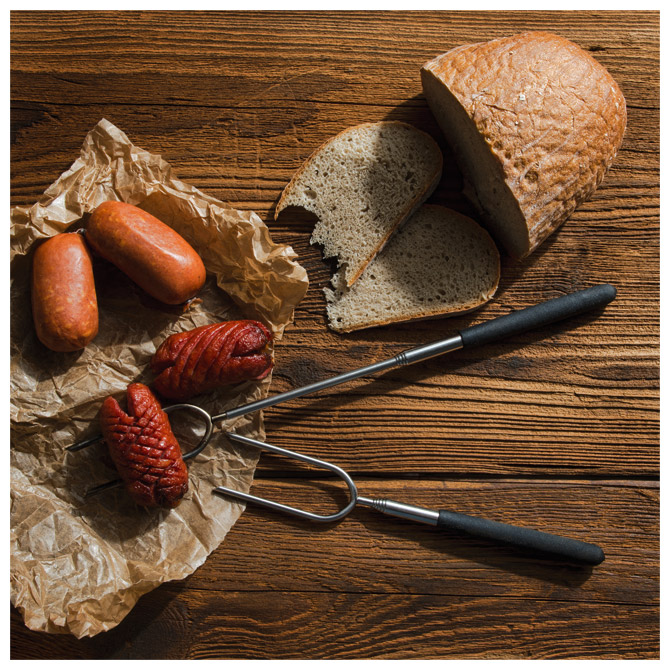 set od dvije teleskopske vilice za roštilj, pakirane u najlonsku torbicu s uzicom; materijal: nehrđajući čelik, PVC ručka; preporučena tehnologija tiska: lasersko graviranje L1, sitotisak S2 na vrećici; maksimalna veličina otiska: 25×5 mm/100×40 mm dimenzije: složeno 24,5 cm, rasklopljeno 86 cm; ugljični otisak: gCO2 e1214 Pakiranje: 1