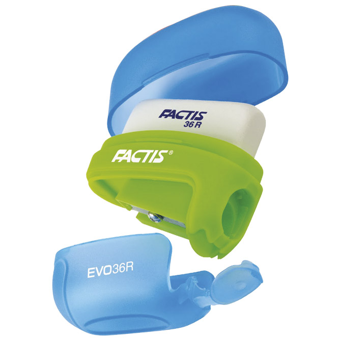 sadrži: šiljilo (PVC; s PVC kutijom; 1 rupa; 2 boje: roza/zelena i plava/zelena) i gumicu (36R, bijela) Pakiranje: 1/16/384