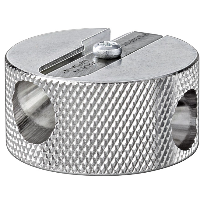 metalno; 2 rupe; za olovke standardne debljine do fi: 8,2 mm sa kutom šiljenja od 23° za precizno pisanje (grafitne) i 30° za šire linije (drvene bojice); jako lagano; blister Pakiranje: 1/10