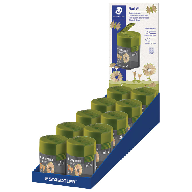 metalno; s PVC kutijom; 2 rupe; za olovke standardne debljine do fi: 8,2 mm sa kutom šiljenja od 23° (grafitne) i 30° (drvene bojice) te Jumbo olovke (grafitne olovke i drvene bojice) debljine do fi: 10,2 mm sa kutom šiljenja od 30°; sigurnosni zatvarač koji sprečava slučajno otvaranje Flowers Pakiranje: 1/10/240