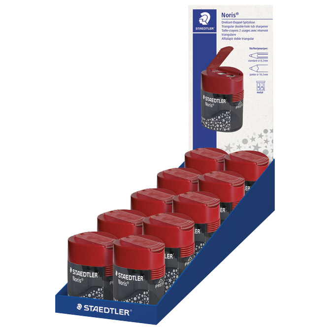 metalno; s PVC kutijom; 2 rupe; za olovke standardne debljine do fi: 8,2 mm sa kutom šiljenja od 23° (grafitne) i 30° (drvene bojice) te Jumbo olovke (grafitne olovke i drvene bojice) debljine do fi: 10,2 mm sa kutom šiljenja od 30°; sigurnosni zatvarač koji sprečava slučajno otvaranje Noris Pakiranje: 1/10/240