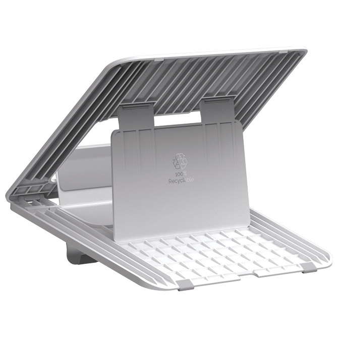 kompaktan i lagan, idealan za hibridni rad, dimenzije: 1,4× 23,5× 26,8, za prijenosna računala do 15″ i 4 kg, preklopljen je potpuno plosnat, a rasklopljenoga se može postaviti u jedan od 12 položaja visine: 13,4/15,3/16,9/18,3/19,4/20,4cm/12,6/14,4/15,9/17,1/18,1/18,9 cm, raspon nagiba:17/22/27/30/34/37°/31/36/40/44/48/50°, materijal koji se može 100 % reciklirati, jamstvo 5 godina Pakiranje: 1/4