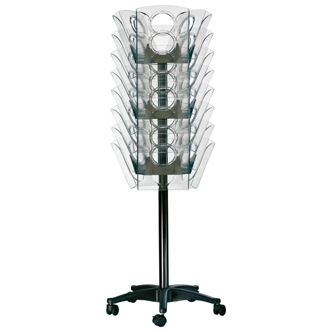 samostojeći; čvrsta metalna konstrukcija; na kotačima s kočnicom za maksimalnu sigurnost; kapacitet: 24 ladice Presenter Leitz 5401 ili 6 kompleta ladica Presenter Leitz 5400 (u tri stupca); ladice nisu uključene u cijenu; visina: 1410 mm bez ladica, 1560 mm sa ladicama; promjer baze: fi 580 mm Pakiranje: 1/20