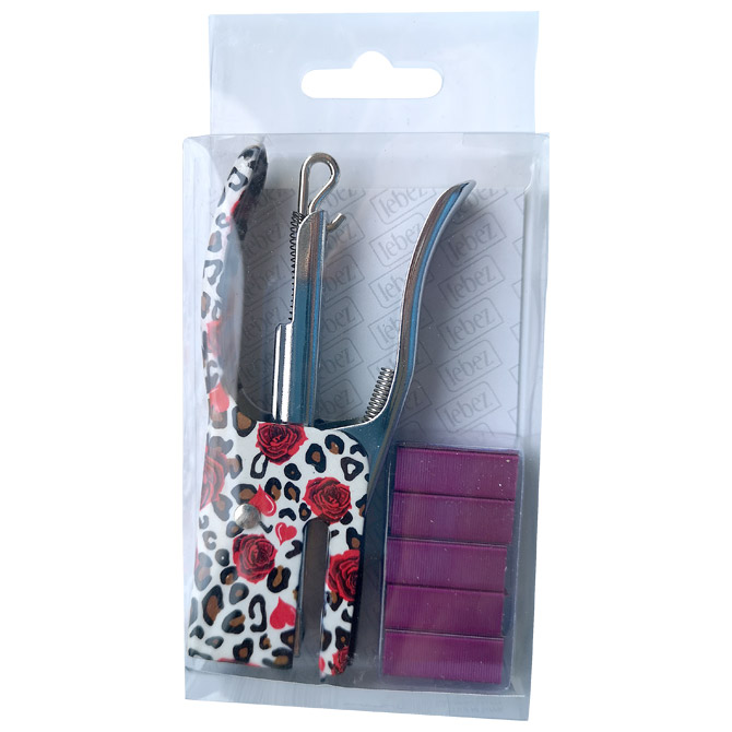 mini; ručni; metalni; spaja do 1,5 mm debljine ili 15 listova papira 80 g/m2; dubina spajanja 27 mm; 2 motiva: bijeli sa ružama (roze spajalice) i bijelo/crni (plave spajalice); spajalice: 1000 kom u boji x br.10; u prozirnoj plastičnoj kutiji; blister Pakiranje: 1/12/144