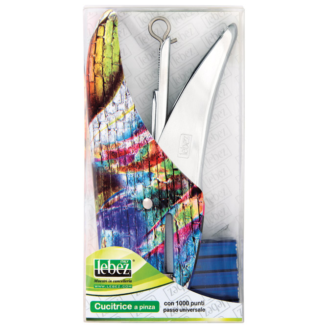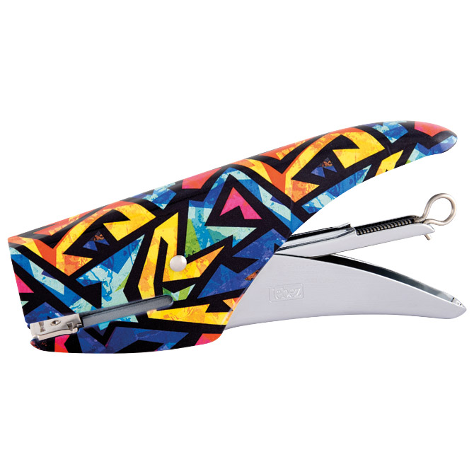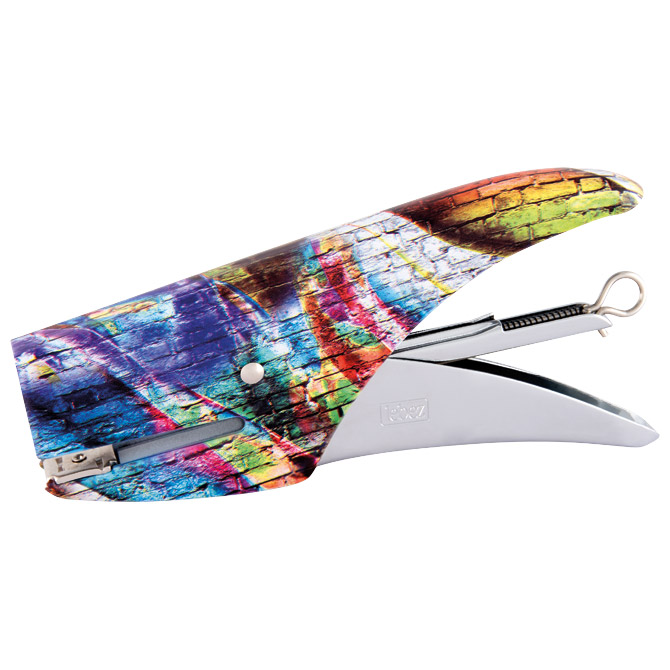 ručni; metalni; spaja do 1,6 mm debljine ili 16 listova papira 80 g/m2; dubina spajanja 45 mm; 2 motiva: mozaik (roze spajalice) i grafiti (plave spajalice); spajanje: otvoreno i zatvoreno; spajalice: 1000 kom u boji x br.8; u prozirnoj plastičnoj kutiji; blister Pakiranje: 1/12/48