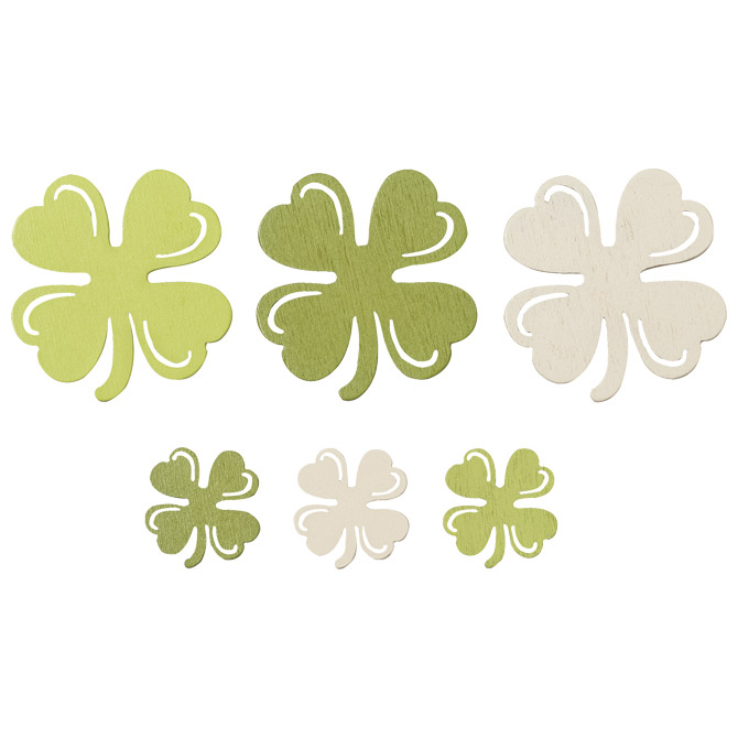 za dekoriranje i izradu raznih ukrasa; u drvenoj kutiji dimenzije:10,5× 10,5 cm; prednja strana je prekrivena folijom tako da se vide motivi; set od 54 komada; blister sretna djetelina / 2 cm i 3,8 cm / 3 boje; boja slonovače, svijetlo zelena i zelena Pakiranje: 1/6