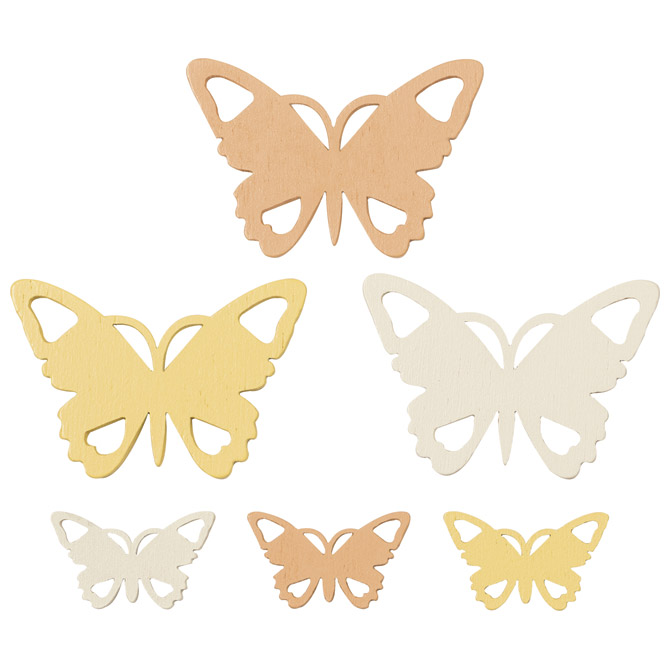 za dekoriranje i izradu raznih ukrasa; u drvenoj kutiji dimenzije:10,5× 10,5 cm; prednja strana je prekrivena folijom tako da se vide motivi; set od 54 komada; blister leptiri / 2,5 cm i 4,5 cm / 3 boje; boja slonovače, boja marelice i svijetlo žuta Pakiranje: 1/6