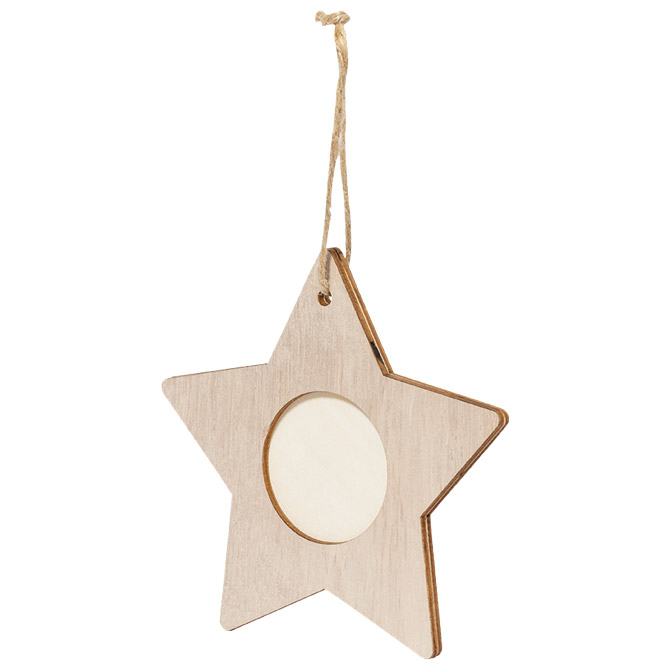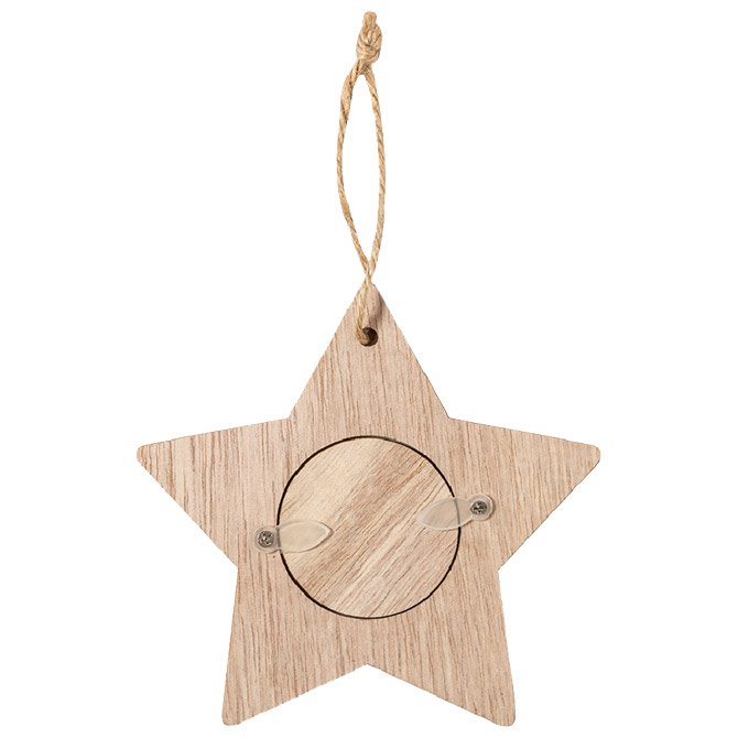Božićni ukrasi s okvirom za fotografije od mekog drva. Prozor za fotografije veličine 4×4 cm i viseći dodatak od prirodne jute. Pakirano u pojedinačnoj recikliranoj vrećici. Pakiranje: 1/100/500