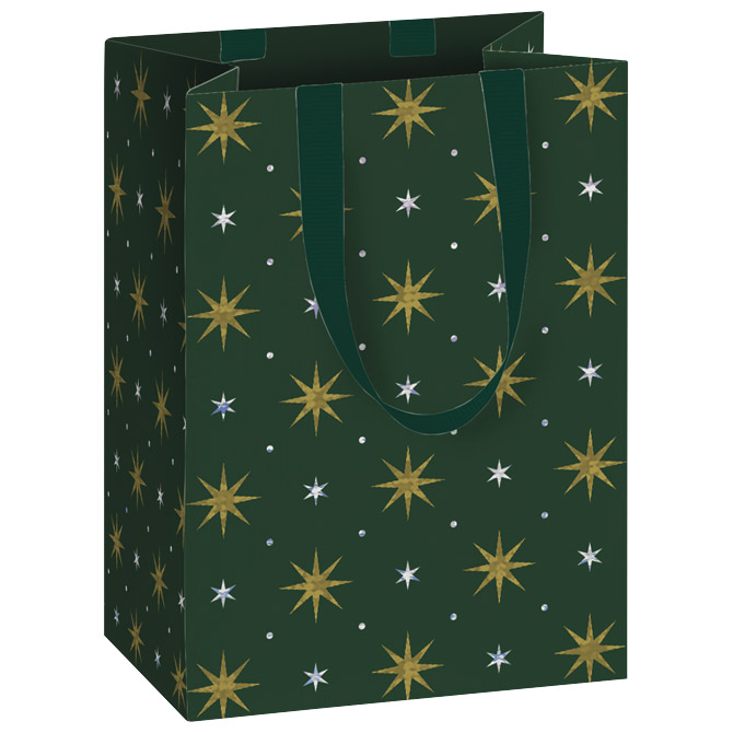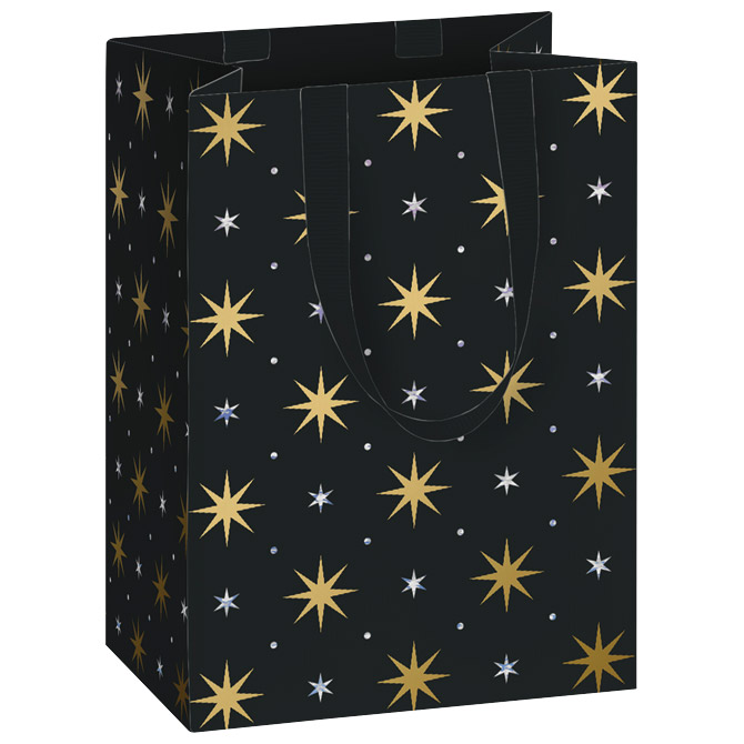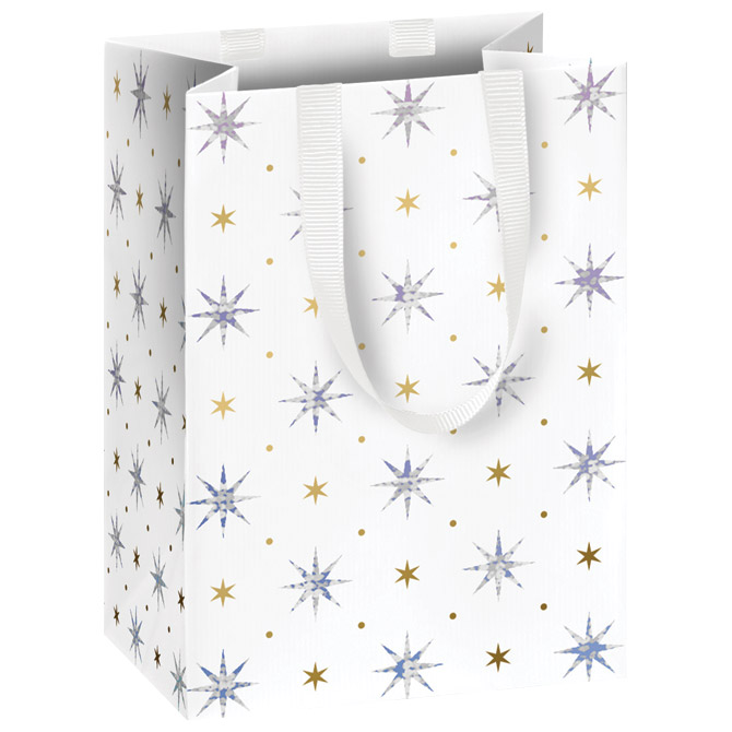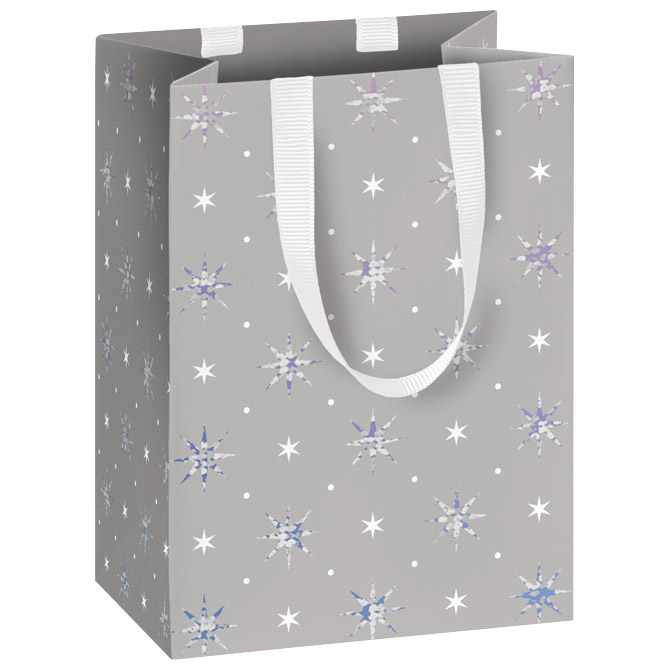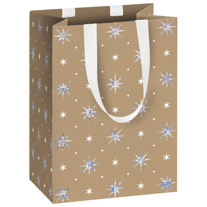 papir bijeli premazni; folija parcijalno; ručke: saten; dimenzija: 10x14x8 cm; motiv: 6 zvjezdice; blister Pakiranje: 1/48
