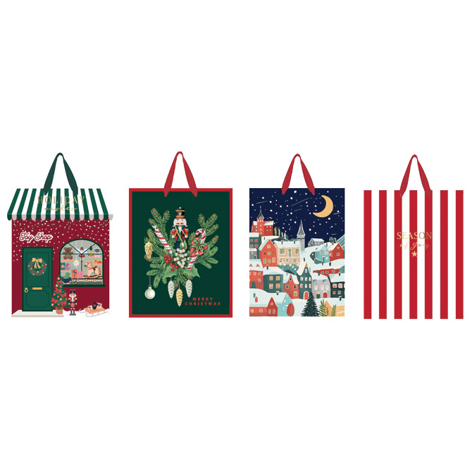 190 g; ručke: saten; ojačano dno; mat završna obrada s metalik detaljima; s privjesnicom; sort 4 motiva 18x23x10 cm Pakiranje: 1/12/144