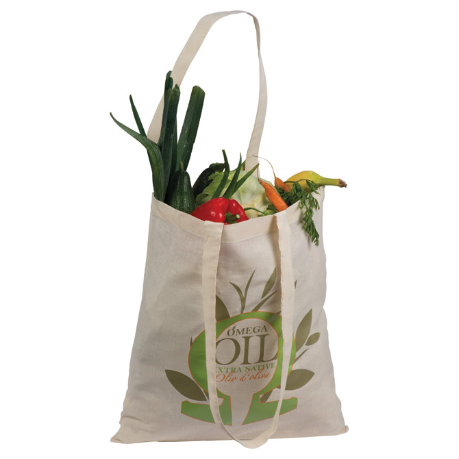 pamučna; dimenzija: 37× 41 cm; materijal 140 g/m2; sa dvije duge ručke (dužina ručki od šava do vrha je cca 38 cm); periva; veličina površine za tisak: 26×27 cm; težina: 67 g Pakiranje: 50/250