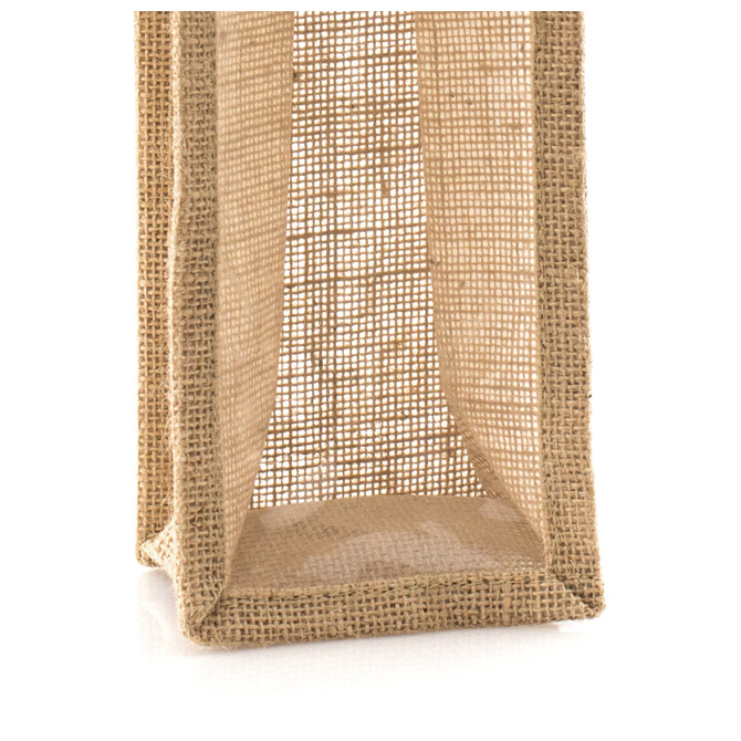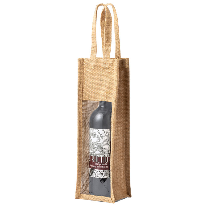 Otporna laminirana jutena vrećica za vinske boce od 75 cl s prozirnim prozorčićem, ojačanim rubom i ručkama. Pakiranje: 1/25/150